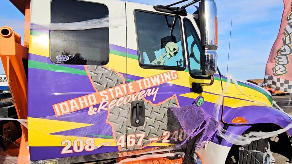 - Idaho State Towing arrived with a massive tow truck turned haunted graveyard, complete with a skeleton in the front seat.